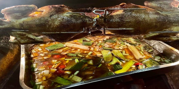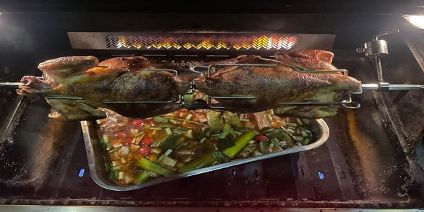 Schwarzfederhuhn auf dem Drehspiss im Grill